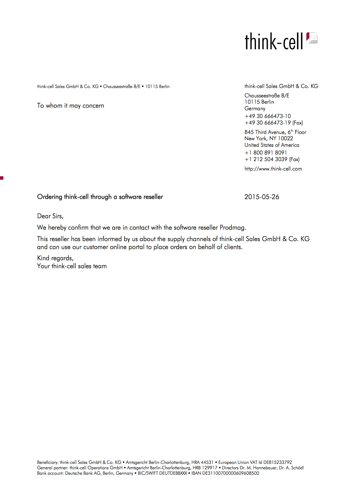 Узнать цены и условия поставки на продукты компании think-cell, а так же получить консультацию по лицензированию Вы можете отправив нам запрос.