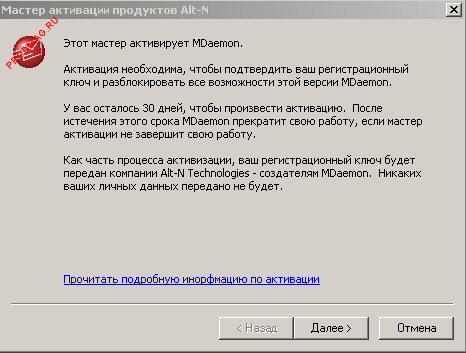 1. При первом запуске MDaemon попросит активировать продукт. Жмем Далее.